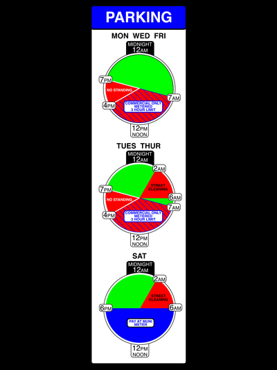 So I redesigned the parking signs as a series of 24-hour clock faces. Midnight is at the top, noon at the bottom, and each pie wedge represents a swath of time where different rules are in effect. You simply need to find your day (which will always appear in order, accounting for overlapping days), then find your current time on the clock. Bingo.